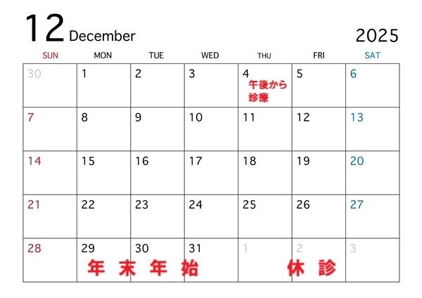 ●12/4(木)は午後からの診療のため、お電話のご予約14:30からとなります